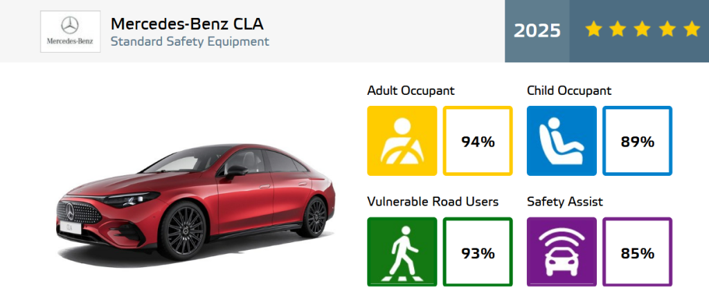 Noul CLA a impresionat juriul cu o performanță aproape perfectă în ceea ce privește protecția ocupanților adulți și un scor de top în clasa sa pentru siguranța participanților vulnerabili la trafic, datorită capotei active avansate și sistemelor AEB rafinate. Generația anterioară s-a impus în clasa familialelor mici, în 2019.