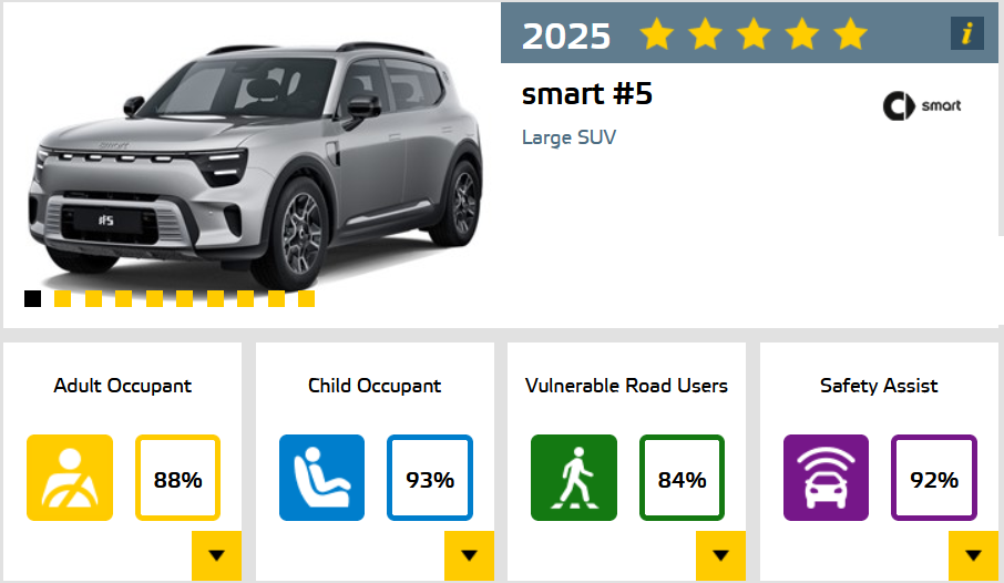 Un nou-venit în segmentul SUV-urilor, marca smart a început să producă mașini mici fără niciun compromis în ceea ce privește siguranța. Noul smart #5, de dimensiuni mari, i-a impresionat pe experții Euro NCAP cu o performanță robustă de cinci stele, dovedind că evoluția mărcii în segmente mai largi nu a venit cu prețul protecției ocupanților.