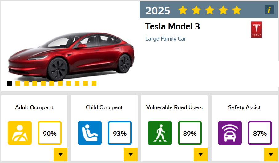 Versiunea actualizată Model 3 rămâne un lider în materie de siguranță. Mașina electrică de familie a obținut scoruri mari în general și a impresionat în special la protecția copiilor. Scorul său Safety Assist arată îmbunătățirea continuă a funcțiilor de asistență pentru șofer.